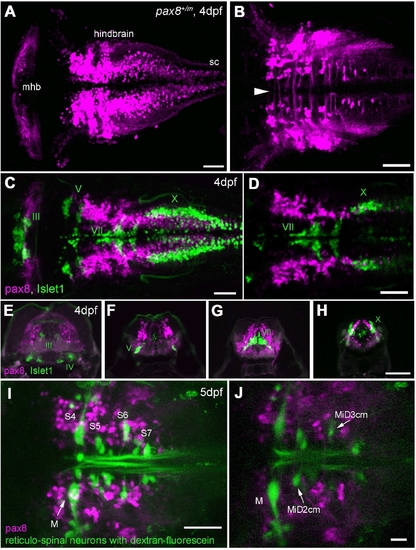 (Magenta/Green version of Figure 9 for the assistance of color blind readers.) Spinal neurons in pax2a/pax8 double mutant. A, B: RFP fluorescence of a pax8+/m embryo (A) and a double mutant embryo (B) under the same optical condition. The RFP signal is reduced in the double mutant. Scale: 1 mm. C, D: The RFP signal in the spinal cord of a pax8+/m embryo (C) and a double mutant embryo (D) near the 15th body segment. 3D images were constructed from confocal slices. Scale: 20 μm. E-H: Stochastic labeling by GFP (green) identified a neuron with an ipsilateral descending axon in the double mutant. E is a 3D reconstruction. F (RFP), G (GFP), and H (merged) are single plane images. Scale: 50 μm. I, J: The spinal cord of a pax8+/m larva obtained from crossing with the Alx-GFP transgenic line. The image is from an embryo at 4 dpf. I is a 3D reconstruction and J is a single confocal plane. Note that RFP and GFP do not overlap. Scale: 20 μm. |