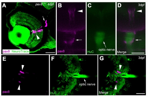 The expression of RFP in glial cells surrounding the optic nerve. A: The RFP signal detected in the eye of a 4 dpf embryo counterstained with NeuroTrace. RFP signal is located around the optic nerve. Scale: 40 μm. B, C, D: In vivo imaging of RFP (B) in a HuC-Cameleon background . Optic nerve emits fluorescence due to the presence of Cameleon (C). D is a merge. Scale: 50 μm. E, F, G: Slice of an eye from HuC-Cameleon fish expressing RFP. RFP (+) cells (E) do not show the expression of Cameleon (F). G is a merge. Scale: 20 7mu;m. Magenta/Green images are provided in Suppl. figure. 7. |