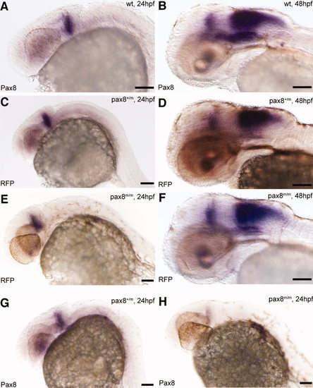 Pax8 expression is identical to RFP expression. Transcripts were detected using in situ hybidization with either pax8 (A,B,G,H) or RFP (C–F) probes in 24-hpf (A,C,E,G,H) or 48-hpf (B,D,F) embryos. Expression pattern, at 24 hpf, of pax8 in wild type (pax8+/+; A) was the same as that of RFP in pax8+/m (C) and pax8m/m (E). Signal was detected in the mhb region of the embryos. RFP showed no signal in wild-type samples (data not shown). At 48 hpf, the staining pattern of pax8 in wild type (B) resembled that of RFP expression in pax8+/m (D) and pax8m/m (F) embryos. Pax8+/m embryos showed positive staining also with the pax8 probe (G). Pax8 transcripts were also detected, at a much lower intensity, in pax8m/m embryos (H). Scale bars = 100 μm. |