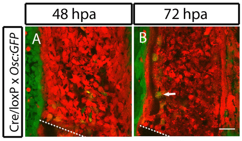 Differentiated scleroblasts from bone lining migrate to integrate in the blastema. (A,B) In vivo confocal images from a double transgenic fish, Tg(eab2:EGFP-T-mCherry; osteocalcin:GFP) injected with Cre mRNA. (A) 48 hpa fin. (B) 72 hpa fin. In B, the arrow indicates a yellow BLS re-expressing osteocalcin at the blastema. Scale bar: 25 μm for all panels. Dashed lines indicate amputation plane. |