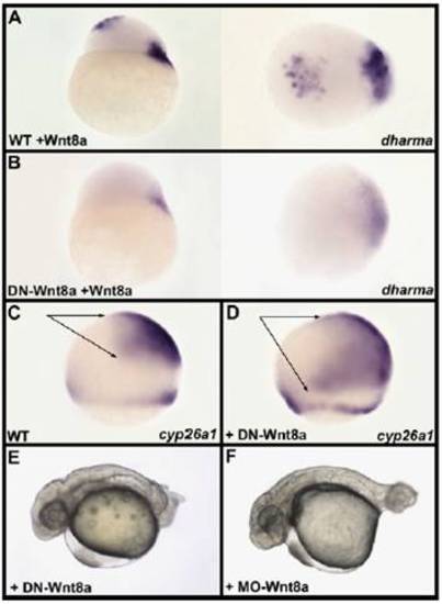 Antagonistic activity of the dominant-negative form of Wnt8a. (A) Injection of 10 pg of Wnt8a mRNA into one animal pole blastomere at the 64-cell stage of a wild-type embryo results in ectopic expression of dharma at the animal pole of a sphere-stage embryo. (Left) Lateral view. (Right) Animal pole view of the same embryo oriented dorsal to the Right. (B) Injection of 10 pg of Wnt8a mRNA in one animal pole blastomere at the 64-cell stage in an embryo previously injected at the one-cell stage with 500 pg of DN-Wnt8a mRNA does not result in ectopic expression of dharma. In addition, endogenous dharma expression at the margin is strongly attenuated. The antagonistic effect of DN-Wnt8a on the induction of dharma at the animal pole is higher than the induction of endogenous dharma because the injection of Wnt8a mRNA in animal pole blastomeres is performed 2 h after fertilization and 1.5 h after injection of DN-Wnt8a, whereas endogenous Wnt8a mRNA present in the cortical cytoplasm can be translated earlier. (Left) Lateral view. (Right) Animal pole view of the same embryo oriented dorsal to the Right. (C and D) Compared with its expression in wild type (WT) (C) the forebrain and midbrain expression of cyp26a1 (arrows) is strongly extended posteriorly (D) in embryos injected with 500 pg of DN-Wnt8a mRNA at the 8- to 16-cell stage. (E and F) At 30 hpf, embryo injected with 500 pg of DN-Wnt8a mRNA displays a phenotype (E) highly similar to the phenotype of Wnt8a morphant (F). Lu