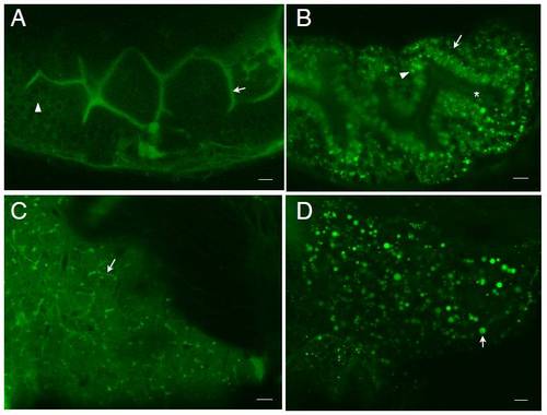 Egg yolk feeding enhances BODIPY-FL C16 uptake and lipid droplet formation in the larval intestine and liver. A. Zebrafish larvae (6 dpf) fed BODIPY-FL C16 in the absence of egg yolk exhibit fluorescence in the intestinal lumen (arrow) and faintly in enterocytes (arrowhead). B. Co-feeding BODIPY-FL C16 with egg yolk enhances analog uptake by intestinal enterocytes. Lipid droplets (arrowhead) appear in enterocytes surrounding the intestinal lumen (asterisk). Nuclei (arrow) appear as dark circles. C. Larvae fed BODIPY-FL C16 in the absence of egg yolk have diffuse accumulation of the analog in their livers. Few lipid droplets appear in hepatocytes, with fluorescence appearing mainly in the cytoplasm of hepatocytes and in hepatic ducts (arrow). D. The livers of larvae co-fed BODIPY-FL C16 with egg yolk have lipid droplets (arrow). Scale bars = 10μm (n = 3 feeds; 4 larvae imaged per feed.) |