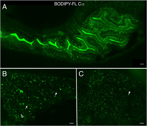 BODIPY-FL C12 is absorbed and transported in the digestive organs of zebrafish larvae. A. The analog appears in the intestinal lumen as well as in lipid droplets in intestinal enterocytes. Diffuse cellular accumulation of BODIPY-FL C12 is consistent with the analog′s shorter chain length, decreased hydrophobicity, faster metabolism, and entry into more subcellular compartments. B. BODIPY-FL C12 readily accumulates in the liver, visualizing large lipid droplets (filled arrowhead), hepatic ducts (arrow), and hepatocyte nuclei (empty arrowhead). C. BODIPY-FL C12 accumulates in fluorescent foci (arrowhead) in the exocrine pancreas. A Scale bars = 10μm. (n = 3; 6 larvae per feed.) |