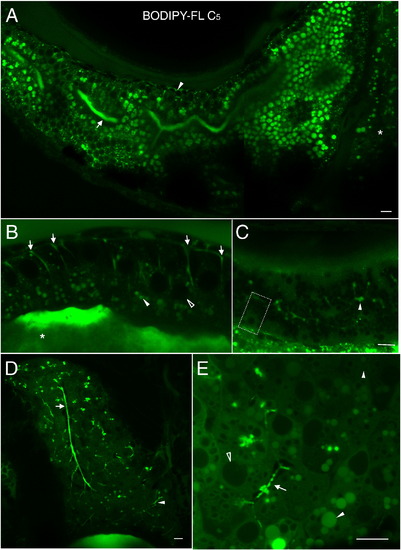 BODIPY-FL C5 reveals significant subcellular details within larval digestive organs (6dpf). A. In enterocytes of the anterior intestine BODIPY-FL C5 appears in structures reminiscent of lipid droplets. Lumenal accumulation of BODIPY-FL C5 in the intestine (arrow) is consistent with the expedited metabolism, transport and biliary concentration of medium chain fatty acids. The analog also appears in a dorsal intestinal blood vessel (arrowhead) and in the liver (asterisk). B. Subcellular enterocyte morphology is visualized following a BODIPY-FL C5 feed. Lipid droplets (filled arrowhead), a nucleus (empty arrowhead), apparent pericellular accumulation of the analog (arrows) and the intestinal lumen (asterisk) are indicated. C. BODIPY-FL C5 visualizes subcellular details of acinar cells and pancreatic ducts in the larval exocrine pancreas. A single acinar cell (dashed box) containing a basal nucleus and apical zymogen granules, as well as pancreatic ducts (arrowhead) is indicated. D. BODIPY-FL C5 feeding illuminates the intrahepatobiliary ductal network. In the right liver lobe, a single long duct (arrow), numerous interconnecting ducts and terminal ductules (arrowhead) are illuminated (see also Supplementary Movie-1). E. Subcellular details of larval hepatocytes are revealed by BODIPY-FL C5 feeding. Lipid droplets (filled arrowhead), hepatocyte nuclei (empty arrowhead), and intrahepatic ducts (arrow) are indicated. A. is a composite of 2 separate confocal images. Scale bars = 10μm. (n = 3; 6 larvae per feed.) BODIPY-FL C5 reveals significant subcellular details within larval digestive organs (6dpf). A. In enterocytes of the anterior intestine BODIPY-FL C5 appears in structures reminiscent of lipid droplets as well as in small endosomal-like compartments. Lumenal accumulation of BODIPY-FL C5 in the intestine (arrow) is consistent with the expedited metabolism, transport and biliary concentration of medium chain fatty acids. The analog also appears in a dorsal intestinal blood vessel (arrowhead) and in the liver (asterisk). B. Subcellular enterocyte morphology is visualized following a BODIPY-FL C5 feed. Lipid droplets (filled arrowhead), a nucleus (empty arrowhead), apparent pericellular accumulation of the analog (arrows) and the intestinal lumen (asterisk) are indicated. C. BODIPY-FL C5 visualizes subcellular details of acinar cells and pancreatic ducts in the larval exocrine pancreas. A single acinar cell (dashed box) containing a basal nucleus and apical zymogen granules, as well as pancreatic ducts (arrowhead) indicated. D. BODIPY-FL C5 feeding illuminates the intrahepatobiliary ductal network. In the right liver lobe, a single long duct (arrow), numerous interconnecting ducts and terminal ductules (arrowhead) are illuminated (see also Supplementary Movie-1). E. Subcellular details of larval hepatocytes are revealed by BODIPY-FL C5 feeding. Lipid droplets (filled arrowhead), hepatocyte nuclei (empty arrowhead), and intrahepatic ducts (arrow) are indicated. A. is a composite of 2 separate confocal images. Scale bars = 10μm. (n = 3; 6 larvae per feed.) |