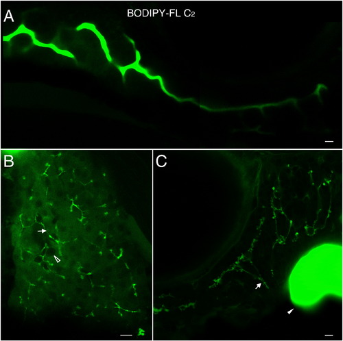 BODIPY-FL C2 does not participate appreciably in lipid metabolism. A. Unlike the longer chain length analogs, BODIPY-FL C2 fluorescence appears primarily in the intestinal lumen of larvae. B. In the liver BODIPY-FL C2 accumulates in the hepatic ducts (arrow) and diffusely in hepatocytes, whose nuclei are discernable (empty arrowhead). C. The ductal network of the exocrine pancreas is also labeled (arrow). The gall bladder (filled arrowhead) is indicated in C. A. is a composite of 2 separate confocal images. Scale bars = 10μm. (n = 3; 6 larvae per feed). |