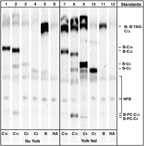 Egg yolk feeding enhances the uptake and metabolism of BODIPY fatty acid analogs by zebrafish larvae. Thin layer chromatography analysis of total larval lipids extracted following analog feeds in the absence (lanes 1–5) and presence (lanes 7–11) of egg yolk. Lanes 6 and 12 are no analog (NA) unfed and yolk fed controls, respectively, and exhibit faint naturally fluorescent lipid bands (NFB). A polar solvent system was used to resolve fluorescent phospholipids (bottom of plate), free analogs (middle), and neutral lipids (top of plate). Abbreviations for fluorescent lipid standards are as follows: BODIPY-Cholesteryl (B-CE-C12), BODIPY-Triacylglyceride (B-TAG-C12), BODIPY493/503 (B), BODIPY-C16 (B-C16), and BODIPY-Phosphatidylcholine (B-PC-C12, B-PC-C5). |