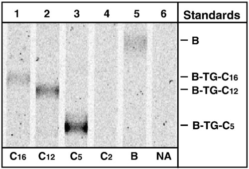 Medium and long chain fatty acid BODIPY analogs are synthesized into triacylglyceride. A second protonating solvent system was used to separate BODIPY493/503 (B) from BODIPY-Triacylglyceride (B-TAGs). Lipid extracts from larvae fed egg yolk without analog (NA) appear in lane 6. (n = 3 concurrent feeds). |