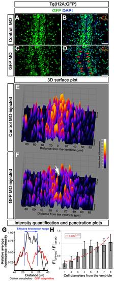 Analysis of morpholino penetration and efficient knockdown range. (A) GFP immunohistochemistry (IHC) on control morpholino-injected (Ctrl-MO) brain sections. (B) DAPI colocalization of A. (C) GFP immunohistochemistry (IHC) on GFP antisense morpholino-injected (GFP-MO) brain sections. (D) DAPI colocalization of C. Red arrows exemplify fully knocked-down cells. (E) 3D surface plot of A. x-axis: distance from the ventricle; y-axis: ventral to dorsal orientation; z-axis: relative level of fluorescence intensity. (F) 3D surface plot of C. x-axis: distance from the ventricle; y-axis: ventral to dorsal orientation; z-axis: relative level of fluorescence intensity. White arrow shows the gap, which indicates the knocked down cells. (G) Intensity quantification plot depicting relative fluorescence intensity versus distance from the ventricle in Ctrl-MO (black lines) and GFP-MO (red lines) injections. Black asterisk indicates the ventricle. Blue bars delineate the borders where GFP-MO injection leads to overt reduction in GFP fluorescence intensity. (H) Penetration prediction graph. The ratio of fluorescence intensity values between Ctrl-MO (FICtrl-MO) and GFP-MO (FIGFP-MO) versus cell diameters away from the ventricle is sketched. The trendline indicates the extent of knockdown in relation to cell diameters. Scale bars 20 μm. |