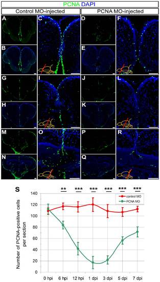 Knocking-down PCNA as an endogenous gene using CVMI. (A) PCNA immunohistochemistry (IHC) on rostral telencephalon of control morpholino-injected (ctrl-MO) brains. (B) DAPI counterstaining on A. (C) High magnification image of medial ventricular region of B. (D) PCNA IHC on rostral telencephalon of PCNA morpholino-injected (PCNA-MO) brains. (E) DAPI counterstaining on D. (F) High magnification image of medial ventricular region of E. (G) PCNA IHC on rostral telencephalon of ctrl-MO brains. (H) DAPI counterstaining on G. (I) High magnification image of medial ventricular region of H. (J) PCNA IHC on telencephalon of PCNA-MO brains on a more caudal level. (K) DAPI counterstaining on J. (L) High magnification image of medial ventricular region of K. (M) PCNA IHC on rostral optic tectum of ctrl-MO brains. (N) DAPI counterstaining on M. (O) High magnification image of dorsal region of N. (P) PCNA IHC on rostral optic tectum of PCNA-MO brains. (Q) DAPI counterstaining on P. (R) High magnification image of dorsal region of Q. (S) Graph depicts the average number of PCNA-positive cells in PCNA antisense morpholino-injected brains (green line) over a time course relative to control morpholino-injected brains (red line). Scale bars 50 μm. hpi: hours post injection, dpi: days post injection. N = 3 adult fish for each time point. |
