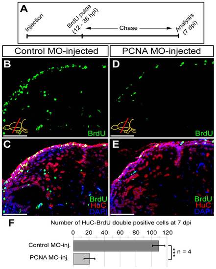 Knocking-down PCNA reduces neurogenesis as a functional consequence. (A) Schematic representation of the neurogenesis assay after PCNA knock-down. Following morpholino injection (control and PCNA-antisense), BrdU is given between 12 and 36 hours. Brains were analyzed at 7 days post injection (dpi) for BrdU (marker for proliferated cells), HuC (neuronal marker) and DAPI as a nuclear counterstain. (B) BrdU immunohistochemistry on the dorsal region of telencephalon from control morpholino-injected brain. (C) Co-staining for HuC and BrdU in control morpholino-injected dorsal telencephalon. (D) BrdU immunohistochemistry on the dorsal region of telencephalon from PCNA morpholino-injected brain. (E) Co-staining for HuC and BrdU in PCNA morpholino-injected dorsal telencephalon. (F) Graph depicts the average number of newborn neurons (HuC-BrdU double-positive cells) in control and PCNA morpholino-injected brains. Scale bars 50 μm. N = 4 adult fish. |