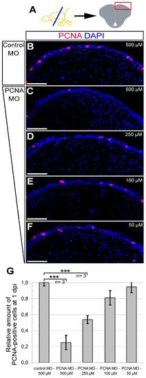 Morpholino-mediated gene knock-down using CVMI is dose-dependent. (A) The dose-response analyses were performed on dorsal regions of telencephalic sections. PCNA immunohistochemistry coupled to DAPI nuclear counterstaining on 500 μM control morpholino-injected (B), 500 μM PCNA morpholino-injected (C), 250 μM PCNA morpholino-injected (D), 100 μM PCNA morpholino-injected (E), 50 μM PCNA morpholino-injected (F) brains. (G) Graph depicts the relative amount of PCNA-positive cells in dorsal telencephalon after every dose in control and PCNA morpholino-injected brains. Scale bars 50 μm. N = 3 adult fish for every dose. |