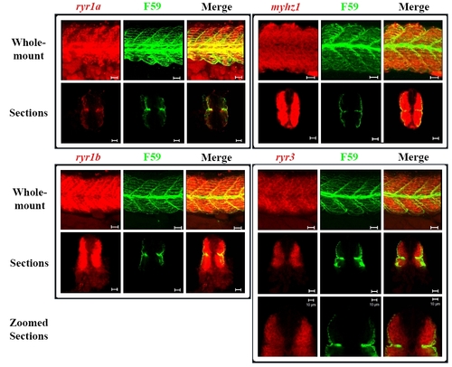 ryr1a, ryr1b and ryr3 mRNA is differentially expressed in the developing skeletal muscle. Double labelling in wholemount embryos at 24 hpf was performed using probes to myhz1, ryr1a, ryr1b and ryr3 and Fast Red as a substrate (red) followed by immunostaining using the F59 antibody and a fluorescent secondary (green). Images show Z-stacks of whole-mount double-labelled embryos (top row) or sections (bottom row) from dissected embryos. Cross-sectional images revealed that ryr1a co-localised exclusively with slow muscle staining, whereas myhz1, a marker of fast muscle, was not expressed in the slow muscle. Furthermore ryr1b expression could be observed throughout both muscle types whereas ryr3 did not co-localise with the slow muscle staining and appeared to be expressed exclusively in the fast muscle. Scale bars = 20 μm, unless otherwise indicated. |