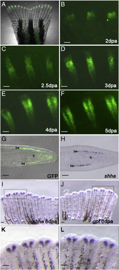 GFP expression recapitulates the endogenous shha expression in the zebrafish transgenic line 2.4shha:gfpABC#15. (A) Bright field and fluorescent images of the caudal fin merge show GFP expression in an intact fin of a 2.4shha:gfpABC#15 transgenic fish. (B–F) Higher magnification of whole-mount images of a few fin rays at different stages of regeneration. (B) At 2 days post amputation (dpa), GFP is expressed in a few cells at the level of the blastema. (C) At 2.5 dpa, GFP expression is restricted to one single domain. (D) At 3 dpa, cleavages start to appear at the proximal end of the GFP-expressing domain and in some rays these cleavages are extending distally. (E) At 4 dpa, a clear separation is visible, and in (F) it is more prominent at 5 dpa. (G) Longitudinal section of a fin regenerate of a 2.4shha:gfpABC#15 transgenic fish at 4 dpa shows GFP expression in the basal layer of the epidermis. (H) In situ hybridization on a longitudinal section of a 4 dpa fin regenerate shows endogenous shha expression in the basal layer of the epidermis. (I–L) In situ hybridization performed on the two lobes of the same fin regenerate at 6 dpa show that shha (I and K) and gfp (J and L) are expressed in the same cell population. The areas indicated by black boxes in I and J are enlarged in K and L. Scale bars in G and H: 20 μm; all other panels: 100 μm. be: basal layer of epidermis; b: blastema. |