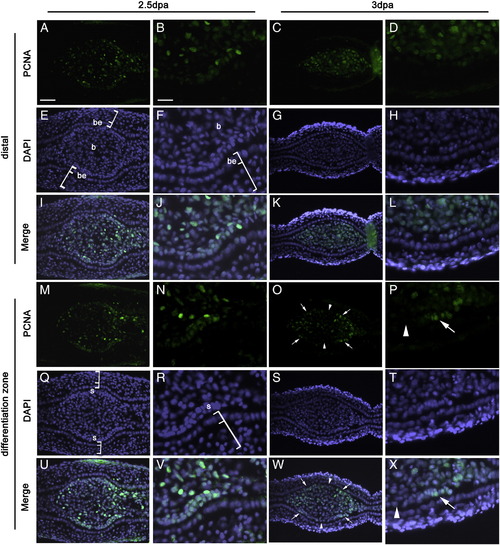 Localized cell proliferation accompanies branch formation. Cell proliferation was detected by immunofluorescence (green) using the proliferating cell nuclear antigen (PCNA) antibody on transverse sections of fin regenerates at 2.5 dpa (A, B, M and N) and 3 dpa (C, D, O and P). DAPI staining (blue) of the same sections is shown in E–H and Q–T. The merged images of the corresponding PCNA and DAPI staining are shown in I–L and U–X. B, F, J, N, R, V, D, H, L, P, T, and X are enlargement of small areas of A, E, I, M, Q, U, C, G, K, O, S, and W, respectively. (A and B) In sections corresponding to the distal part of the fin regenerate at 2.5 dpa, PCNA positive cells are abundant in the blastema. There is no PCNA + cells in the epidermis. (C and D) At 3 dpa, the distribution of PCNA + cells in the distal regenerate is similar to that in (A). (M and N) At 2.5 dpa, in sections corresponding to the differentiation zone, PCNA + cells are more concentrated in the scleroblasts lining the epidermis than in the center of the connective tissue. (O and P) At 3 dpa, as at 2.5 dpa (M), there is a higher concentration of PCNA + cells in scleroblasts than in the central part of the ray but in contrast to 2.5 dpa, the proliferating scleroblasts are localized on the two lateral sides of the hemiray. Note: Bright PCNA staining corresponds to cells that are actively proliferating at the time of tissue fixation. Some residual staining in cells of the connective tissue reflects the past proliferative state of these cells. Arrows in (O, P, W and X) indicate the localized proliferation of the scleroblasts. Arrowheads in (O, P, W and X) indicate the central scleroblasts that show no PCNA signal. Brackets in E, F, Q and R indicate the epidermis. Scale bars: A, E, I, M, Q, U, C, G, K, O, S and W (shown in A) = 20 μm; B, F, J, N, R, V, D, H, L, P, T and X (shown in B) = 7 μm. be: basal layer of epidermis; b: blastema; s: scleroblast. |