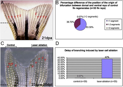 Laser ablation induces a delay of ray branching. (A) Caudal fin regenerate observed at 21 days following amputation below the first branching point of the rays. Ray numbers are shown in red; the corresponding rays on the ventral and dorsal lobes have the same number (ray 1 that never forms bifurcation is not indicated). Red lines indicate the position of the first branching point of five ray regenerates of the ventral and dorsal lobes, respectively. (B) percentage difference in the position of the origin of bifurcation (measured in number of segments) between the corresponding rays of the dorsal and ventral lobes observed in fin regenerates (n = 30) at 21 dpa. Only 0.07% of the rays show a difference greater than 2 segments of the origin of bifurcation. (C) Fin regenerate at 20 dpl of a 2.4shh:gfpABC#15 transgenic fish after laser cell ablation of the GFP positive cells in rays 2, 3, 4, of the ventral lobe at 3 dpa. The red lines indicate the origin of bifurcation in rays 2, 3, 4 in the control side and the side where laser ablation has been performed, respectively. (D) Graph showing the percentage of rays presenting a difference greater than 2 segments in the position of the origin of bifurcation between the ventral and dorsal lobes, in control fins (no ablation) (left bar) and in experimental fins (right bar) in which GFP positive cells have been ablated in rays of the ventral lobe. Dashed lines indicate the level of amputation. |