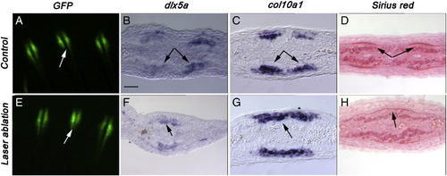 Laser ablation induces a delay in the splitting of the domain of expression of dlx5a and col10a1. At 6 dpa 3 dpl, control (A, B, C and D) and laser-ablated fin rays (E, F, G and H) were observed for GFP expression (A and E) or collected for gene expression analysis (B, C, D and F) or picrosirius red staining (G and H) on transverse sections. In control fin regenerates, at 6 dpa, (A) GFP expression (B) dlx5a, (C) col10a1 and (D) picrosirius red staining are observed in two separate domains. In experimental fin rays, at 6 dpa, 3 days after ablation of the GFP positive cells, (E) GFP expression is starting to separate in two domains while (F) dlx5a, (G) col10a1 and (H) picrosirius red staining are still observed in a unique domain in each fin ray. Arrows indicate one or two domains of expression/staining per fin ray. Scale bar in panels B–H = 20 μm. |