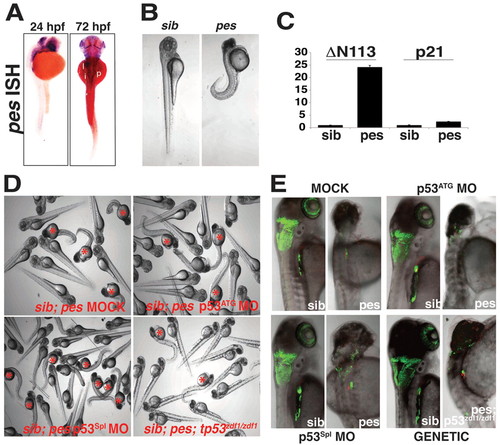 The pes mutant phenocopies SbdsATG MO-induced p53-independent defects in pancreas development. (A) In situ hybridization at 24 hpf demonstrates pes expression in the eye and central nervous system. At 72 hpf, pes expression is detected in endoderm, including the developing pancreas. (B) The peshi2Tg/hi2Tg phenotype includes axis defects (tail curvature), a small dark head and a small eye. (C) Semi-quantitative RT-PCR of peshi2Tg/hi2Tg embryos reveals activation of the p53 target genes Δ113p53 (24-fold, P<0.0001) and p21 (2.4-fold, P<0.01). Error bars indicate s.e.m. (D) Loss of p53 does not rescue axis defects in peshi2Tg/hi2Tg embryos. Representative images of siblings (sib) generated either from a peshi2Tg/WT incross and injected with or without (Mock) p53ATG MO or p53Spl MO, or from a peshi2Tg/WT;p53zdf1/zdf1 incross. Asterisks indicate siblings displaying the pes phenotype. See supplementary material Fig. S6 for quantification. (E) peshi2Tg/hi2Tg embryos exhibit a p53-independent defect in expansion of ptf1-expressing pancreatic progenitor cells. The pancreatic progenitor defect in 72-hpf peshi2Tg/hi2Tg;ptf1a:eGFP;ins:mCherry embryos is not rescued by p53 MO-mediated knockdown, nor by genetic inactivation of p53 as assessed by incross of peshi2Tg/WT;p53zdf1/zdf1;ptf1a:eGFP;ins:mCherry fish. EXPRESSION / LABELING: