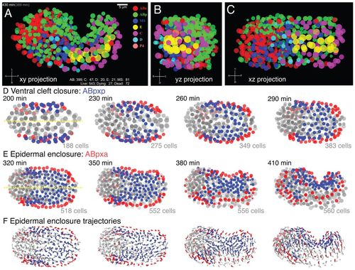 Visualization of late stage C. elegans embryonic morphogenesis with single cell resolution. Visualization of morphogenetic movements from digital 4D movies, focusing on epidermal enclosure. Nuclei are depicted as semitransparent circles (A-E) or as trajectory flow fields (F). (A-C) Orthogonal views of 430-minute embryo; see also supplementary materialMovies 1, 2. Time stamps at upper left denote actual movie time (gray, in parentheses) and estimated time since first cleavage (movie time + 91 minutes). The counters on lower right side show numbers of surviving descendants of each sublineage, total number of live nuclei, dying nuclei (cells undergoing apoptosis but still visible) and dead nuclei (no longer visible). All views are of the same data set from the ventral surface (xy view, A), posterior side (yz, B) and left lateral side (xz, C). Cells are color coded according to lineage origin. (D,E) ABp descendants undergo successive epiboly-like collective movements towards the ventral midline (yellow) during gastrulation cleft closure (200-290 minutes, D) and epidermal enclosure (320-410 minutes, E). ABpxp descendants (blue) are predominantly involved in ventral cleft closure; ABpxa descendants (red) are predominantly involved in epidermal enclosure. Images are every 30 minutes; cell counts include live and dying cells. (F) Flow field of nuclear trajectories during epidermal enclosure; ABpxx lineage coding as in D,E; 15-minute trajectories. |