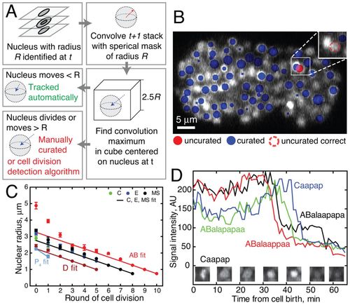 Automated nuclear tracking using local search. (A) Overview of the tracking algorithm in NucleiTracker4D. The tracking component searches the neighboring space of each nucleus identified at t for new convolution signal maxima. Only nuclei not satisfying the automatic tracking condition (e.g. displacement≥R) are prompted for manual curation. (B) An example of a tracking error requiring manual curation. Here, an AB nucleus was mis-tracked towards one of its MS neighbors owing to differing brightness among sublineages. The user corrected position is marked with a dashed red line. (C) Variation in nuclear radii in the major embryonic sublineages. The linear fit is used as a model of nuclear radius in NucleiTracker4D. For early cells (AB, C, E, MS) n≥5 (data from five embryos with a nucleus present in at least one time point); for all other cells, 16≥n≤32, from two embryos with nuclei present for at least two time points. Where more than eight descendants (after third round of division) are present at one time point, cells quantified were picked at random. Error bars represent s.e.m. (D) Apoptotic cells undergo characteristic changes in HIS-72::GFP fluorescence; see supplementary material Movie 3. Nuclei of dying cells are assigned a radius according to the model until signal intensity decreases sharply corresponding to DNA condensation (~25 minutes after cell birth). At this point the dying cell nuclear radius is plotted as a minimal radius (0.5 μm). After another ~20 minutes, the HIS-72::GFP signal decreases as the cell is engulfed. |