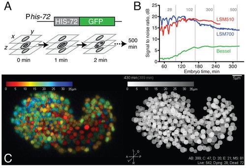 4D data acquisition and image properties. (A) Schematic of acquisition setup. We use laser scanning confocal microscopy to acquire z-stacks every minute for 5 hours of embryo development followed by z-stacks every two minutes for 3 hours at 20-24°C. Acquisition of each stack takes 12-15 seconds at 512 × 275 × 35 voxels. (B) Comparison of signal-to-noise ratio (SNR) of raw data from 4D movies taken using Zeiss LSM510, Zeiss LSM700 and Bessel beam microscopy. Image acquisition was optimized for image quality compatible with viability; under these parameters, the LSM510 and LSM700 data sets showed comparable SNR. (C) Comparison of confocal image (color depth code, projection of LSM700 z-stack, 430 minutes) with digital representation (gray scale depth code). EXPRESSION / LABELING: