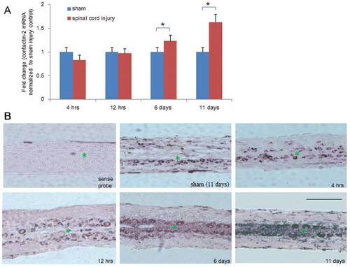 Time course of contactin-2 mRNA expression after spinal cord injury. (A) Quantitative PCR (qPCR) shows expression of contactin-2 mRNA in the spinal cord caudal to the lesion site at four time points after SCI. Significant upregulation was observed at 6 and 11 days after SCI compared to the sham injury group (*p<0.05, one-way ANOVA with Tukey’s post-hoc test; n = 8 fish/group). Values represent means+SEM. (B) In situ hybridization detection of contactin-2 mRNA in longitudinal sections of the spinal cord 3 mm caudal to the lesion site at 4 and 12 hrs, and at 6 and 11 days after SCI (n = 3 fish/group). Numbers of positive cells were increased along the central canal at 6 and 11 days after SCI compared to the sham injury group at 11 days. No signal was detected in sections incubated with a sense probe. * indicates the central canal. Scale bar, 400 μm. EXPRESSION / LABELING: