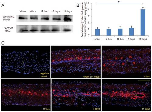 Time course of contactin-2 protein expression after spinal cord injury. (A) Western blot analysis shows contactin-2 protein expression in the spinal cord caudal to the lesion site at four time points after SCI. Significant upregulation was detected at 11 days after SCI compared to the sham injury group at 11 days. (B) The intensity of bands as quantified by ImageJ software and fold change compared with the sham injury group shows an increase in contactin-2 protein level that achieved significance at 11 days after SCI (*p<0.05, one-way ANOVA with Tukey’s post-hoc test; n = 5 fish/group). Values represent means+SEM. (C) Contactin-2 expression in the spinal cord 3 mm caudal to the lesion site was examined by immunofluorescence in longitudinal sections at 4 and 12 hrs, and at 6 and 11 days after SCI. Upregulation of contactin-2 was mainly observed along the central canal at 11 days after SCI. Negative control (without primary antibody), contactin-2 (red), DAPI (blue). * indicates the central canal. Scale bar, 200 μm. EXPRESSION / LABELING: