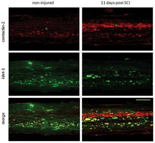 Contactin-2 protein expression is upregulated by motoneurons along the central canal after spinal cord injury. Double immunolabeling of contactin-2 with islet-1 in longitudinal sections (3 mm caudal to the lesion site) shows that in the spinal cord of non-injured zebrafish, contactin-2 is prominently expressed by motoneurons and other cell types. At 11 days after SCI, contactin-2 expression is increased compared to non-injured fish along the central canal. * indicates the central canal. Scale bar, 200 μm. EXPRESSION / LABELING: