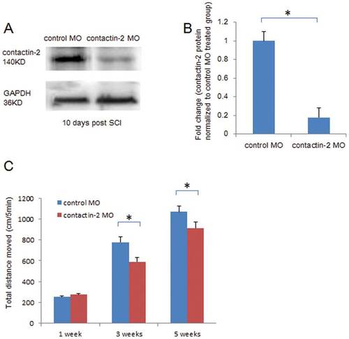 Knock down of contactin-2 expression after spinal cord injury retards locomotor recovery after spinal cord injury. (A) Contactin-2 protein expression is reduced at 10 days after SCI by application of contactin-2 antisense morpholino (MO) as detected by Western blot analysis. (B) Intensity of the bands as quantified by ImageJ software, and fold change compared with control MO treated group shows a decrease in contactin-2 protein level at 10 days after application of contactin-2 MO (*p<0.05, Student’s t-test; n = 5 fish/group). Values represent means+SEM. (C) Total distance moved in 5 min of undisturbed zebrafish treated with contactin-2 MO or control MO (n = 8 fish/group) after SCI. At 3 and 5 weeks after SCI, the total distance moved was reduced by treatment with contactin-2 MO when compared to fish treated with control MO (*p<0.05, one-way ANOVA with post-hoc Student-Newman-Keuls test; n = 8 fish/group). Values represent means+SEM. PHENOTYPE: