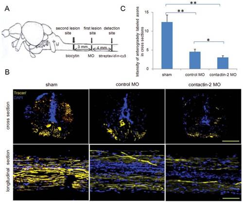 Reduction of contactin-2 protein expression after spinal cord injury impairs regrowth of axons. (A) Schematic illustration for anterograde tracing. Biocytin was applied at the site symbolized by the second lesion site at 6 weeks after the first lesion. After 24 hrs, biocytin was detected at the site 4 mm distal to the first lesion site by Streptavidin-Cy3. (B) Cross and longitudinal sections show axons regrown beyond the first lesion site. (C) Relative fluorescence intensity for cross sections was quantified by ImageJ software. A 34% decrease in intensity was observed in the contactin-2 anti-sense MO treated group compared to the control MO treated group (*p<0.05, **p<0.01, t-test; n = 3 fish/group). The sham injury group shows similar intensities as the non-injury group. Scale bars, 200 μm. PHENOTYPE: