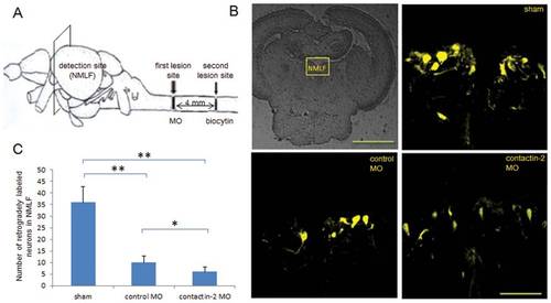Reduction of contactin-2 protein expression after spinal cord injury impairs axon regrowth of NMLF neurons. (A) Schematic illustration for retrograde tracing. Biocytin was applied at the site symbolized by the second lesion site at 6 weeks after the first lesion, and was detected in the NMLF after 24 hrs using Streptavidin-Cy3. (B) Retrogradely labeled neurons in the NMLF. (C) Numbers of retrogradely labeled neurons in the NMLF. Reduction of contactin-2 protein expression by application of contactin-2 anti-sense MO reduces the numbers of NMLF neurons with axons regrown beyond the first lesion site when compared to the control MO treated group (*p<0.05, t-test; n = 3 fish/group). The sham injury group shows similar numbers of retrogradely labeled neurons as the non-injury group. Scale bars, 200 μm and 50 μm. |