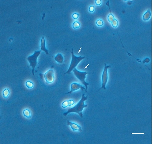 Dissociated spinal neuron cultures show neurons and a mixed population of other cell types, morphologically resembling myoblasts and glial cells. Arrows: myoblasts. Scale bar, 20 μm. |