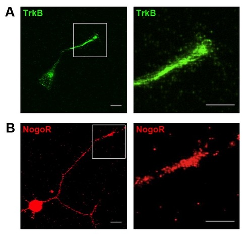 Staining with antibodies to mammalian BDNF receptor TrkB and MAG receptor NgR reveals high immunoreactivity at spinal neuron cell bodies. |