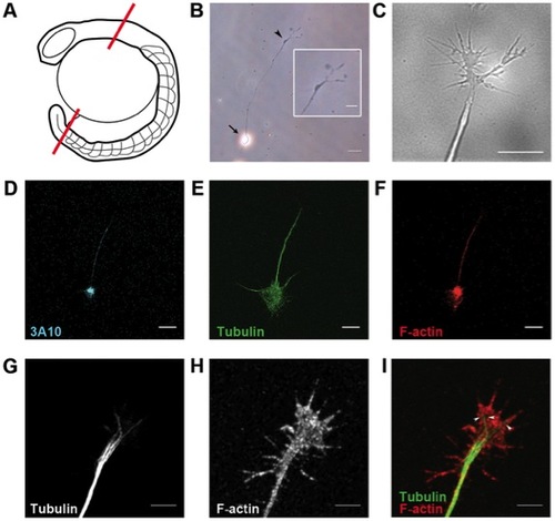 Characterization of zebrafish spinal neurons in culture. (A) Diagram of spinal cord dissection. Red lines indicate cut sites. (B) Dissociated spinal neuron in culture. Inset shows magnified view of growth cone with filopodia. Arrow: neuron cell body. Arrowhead: growth cone at axon tip. (C) Differential interference contrast live imaging shows filopodia and lamellipodia at the axon tip. Immunostaining for (D) neurofilament associated antigen, (E) tubulin, and (F) F-actin. Magnified views of growth cones reveal (G) bundled microtubules projecting along axons and terminating in the growth cone central domain, while (H) F-actin filaments are abundant in the peripheral filopodia and lamellipodia. (I) Merged image of growth cone cytoskeleton organization. Arrowheads: individual microtubules. Scale bars, 20 μm (B), 10 μm (B inset, D–F), 5 μm (C, G–I). |