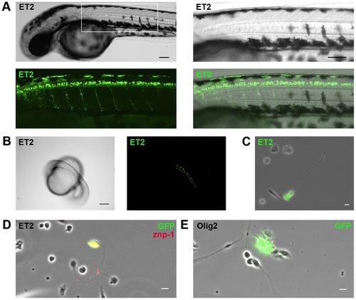 Transgenic neuron culture reveals presence of motor neurons and glial cells. (A) Mn2Et motor neuron reporter line zebrafish at 48 hpf express GFP in spinal cord motor neurons that innervate axial trunk muscles, and at (B) 20 hpf express GFP in paired spinal cord motor neurons. (C) Cultured spinal cord neurons from mn2Et reporter line zebrafish express GFP in vitro. (D) Immunostaining for primary motor neuron antigen znp-1 and GFP confirms presence of motor neurons in mn2Et spinal cultures. (E) Immunostaining for GFP confirms presence of glial cells in Tg(olig2:EGFP) oligodendrocyte precursor reporter line spinal cultures. Scale bars, 50 μm (A) and 10 μm (B, C, D). |