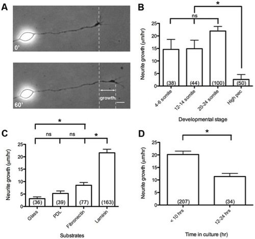 Functional growth characteristics of zebrafish spinal neurons. (A) Diagram of outgrowth assay to measure neurite growth over 1 hr. (B) Spinal neuron growth rates from embryos at 4–6 somite, 12–14 somite, 20–24 somite, and high pec stages. (C) Spinal neuron growth rates on different substrates, and (D) before 10 hr and between 12–24 hr in culture on laminin. Scale bar, 5 μm. *, p<0.05; ns, not significant. |