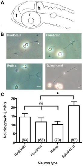 Primary culture of CNS neuron classes and growth rates in vitro. (A) Diagram of CNS neuron harvest sites. f, forebrain. h, hindbrain. r, retina. (B) Dissociated primary cultures of CNS neurons. Arrowheads: growth cones at axon tips. (C) Growth rates of CNS neurons. Scale bar, 10 μm. *, p<0.05; ns, not significant. |