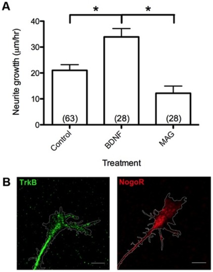 Positive and negative mammalian cues regulate axonal outgrowth. (A) Treatment with BDNF promotes while MAG inhibits axon outgrowth. (B) Staining with antibodies to mammalian BDNF receptor TrkB and MAG receptor NgR reveals high immunoreactivity at spinal neuron growth cones. Scale bar, 5 7mu;m. *, p<0.05. |
