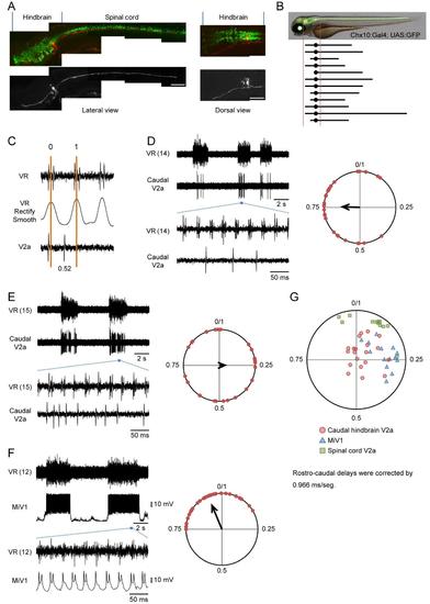 Activity of hindbrain V2a neurons during fictive swimming Compound transgenic fish of Tg[chx10:Gal4] and Tg[UAS:GFP] at 3 dpf were used for the experiments. (A) and (B), Electroporations of rhodamin dye into the small V2a neurons in the caudal hindbrain. (A), A representative example. The left panels show lateral views of the labeled neurons. The right panels show dorsal views of the labeled neurons in the hindbrain. The neurons projected both rostrally and caudally. Scale bar, 100 μm. (B), Schematic views showing the trajectories of 12 neurons that were investigated. All of the neurons projected to the spinal cord. In addition, many of the neurons also had axons that projected rostrally in the hindbrain. (C), The method to determine the phase value in the circular plot. VR recordings (top) are rectified and smoothened (middle). The phase values of 0 and 1 are given to a central time point of a VR activity and that of the next VR activity, respectively. Then, phase values are given to spikes of V2a neurons (bottom). (D) and (E), Loose-patch recordings from the small reticulo-spinal V2a neurons in the caudal hindbrain. The numbers in parentheses indicate the locations of the VR recordings. The right panels show circular plots that show the phasic relation of V2a neuron spikes to VR activity. The phase values of 30 randomly selected spikes are plotted in the circles. (F), A whole-cell recording of a MiV1 neuron. The numbers in parentheses indicate the locations of the VR recordings. The right panels show a circular plot that shows the phasic relation of MiV1 neuron spikes to the VR activity. The phase values of 30 randomly selected spikes are plotted in the circles. (G), The apexes of the vectors of the recorded neurons are plotted in a circle. For the small reticulo-spinal V2a neurons in the caudal hindbrain, only those neurons whose firing frequencies were more than 0.1 are included. The phase values in this plot are compensated such that VR recordings would have been made at the position of the recorded neurons by using the value of 0.966 ms/segment. n = 20 for the small reticulo-spinal V2a neurons; n = 14 for the MiV1 neurons; and n = 12 for the spinal V2a neurons. |