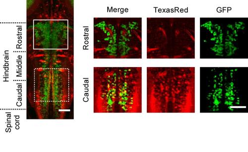V2a Neurons in the Hindbrain Compound transgenic fish of Tg[chx10:Gal4] and Tg[UAS:GFP] at 3 dpf. The two panels on the left are dorsal views. GFP-expressing neurons are present in the hindbrain and the spinal cord. The asterisks show the GFP signal in the tectums that are originated from GFP-positive cells in the retina. The three panels on the right are cross-sections. The dotted circle demarcates the hindbrain. Scale bar represents 100 μm. |