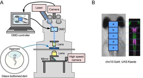 Photo-stimulation of V2a neurons (A), A schematic of the experimental setup. A larva was mounted on agarose with its tail left free. The region and duration of the photo-stimulation is controlled by digital micro-mirror device (DMD) that is attached to the upright epifluorescent microscope. Movements of the larva are monitored from the bottom using a high-speed camera. (B), Demonstration of region-specific illuminations using Kaede transgenic fish (Tg[chx10:Gal4] and Tg[UAS:Kaede] at 3 dpf). Areas boxed with “a–e” correspond to regions of the photo-stimulations in the ChR experiments. In this larva, regions “b”, “d,” and the spinal cord caudal to region “e” were illuminated with violet light. Magenta represents photo-converted Kaede. |