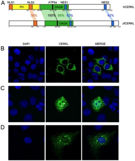Human and zebrafish CERKL protein domains. (A) The reported hCERKL (NP_963842) protein domains described by either sequence homology (PH, pleckstrin homology; DAGK, diacylglycerol kinase and ATPbs, ATP binding site domains) or by functional analysis (NLS, nuclear localization signals; NES, nuclear export signals) and their conservation in zebrafish is shown in percentage of identity. (B–D) ZFCerkl-HA shares with human CERKL the dynamic subcellular localization in COS-7 transfected cells, shifting from the cytoplasm to the nucleus. Nuclei were stained with DAPI. Images correspond to individual optical sections. Photographs were at×63 magnification. (B) In most cells, ZFCerkl shows a uniform distribution in the cytosol and is absent from the nucleus. (C) Some cells per field showed localization of Cerkl in both, the cytosol and the nucleus, with clear exclusion from the nucleoli (white arrow). (D) Rarely, Cerkl contributes to cytosolic aggregates. |
