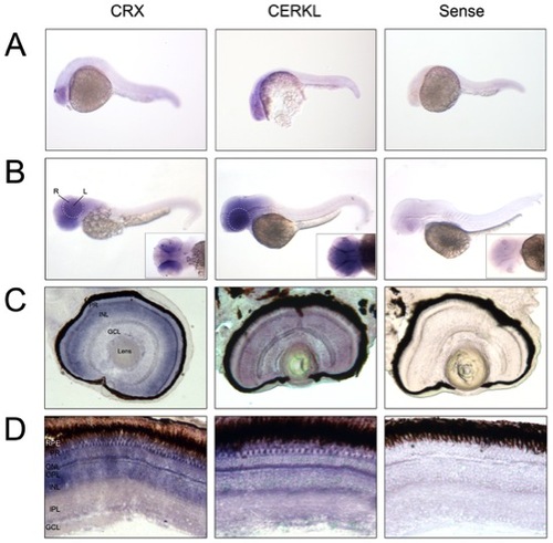 Cerkl in situ hybridization on embryo and adult zebrafish. (A and B) Whole-mount RNA in situ hybridization analysis showing cerkl expression in the retina and brain of embryos at 24 and 50 hpf. R, retina; L, lens. (C and D) In situ hybridization on zebrafish retina cryosections of 72 hpf embryos and adult tissue. Cerkl expression is detected in the three nuclear layers of the embryo retina, whereas adult expression appears in the inner segment of the photoreceptors and some cells located at the basal layer of the INL. Positive control (antisense CRX), strongly labels the inner photoreceptor segment and inner nuclear layer. The negative control was performed with sense cerkl. RPE, retinal pigment epithelium; PR, photoreceptor; ONL, outer nuclear layer; OPL, outer plexiform layer; INL, inner nuclear layer; IPL, inner plexiform layer; GCL, ganglion cell layer. |
