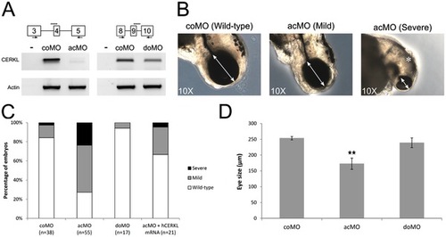 Effects of ZFcerkl silencing in eye development. (A) Two morpholinos targeting an acceptor (acMO) and donor splice site (doMO) of ZFcerkl were used. The morpholino targeting site is depicted by a discontinuous line. To assess the knockdown effect, a RT-PCR analysis of control and ZFcerkl morphants injected with 8 ng of MO was performed (primers used are depicted with arrows). Silencing with acMO was almost complete, when compared with cerkl expression in 72 hpf control MO-injected embryos (coMO), whereas in doMO animals the WT spliced isoform was decreased by 35%. β-Actin was used for normalization. (B) acMO-injected embryos displayed either small eye phenotype (named mild phenotype) or very small eye, small head, and body and curved tail (named severe phenotype). White double-head arrows denote diameter of the eyes. * denotes small and curved head in severe-phenotype morphants. (C) Phenotype frequency of morphants. The cerkl-knockdown phenotype was rescued when human CERKL mRNA was co-injected with acMO. n, number of individuals. (D) Eye size (in diameter) was measured in at least ten independent embryos from each group. Data were analyzed by t-test and are presented as mean ± SEM. ** P<0.001. Mean eye size was 253.4 µm for control, 172.7 μm for acMO and 239 μm for doMO morphants. PHENOTYPE: