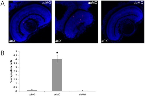 Increased cell death in ZFcerkl morpholino (acMO)-injected embryos. (A) Immunodetection of apoptosis by anti-active Caspase-3 in retina cryosections of 72 hpf control (coMO) and ZFcerkl morpholino-injected embryos (acMO and doMO). Caspase-3-positive cells (shown in red) increased in acMO morphants. Nuclei were stained with DAPI. (B) The percentage of apoptotic cells in each retina within a single cell layer was quantified in four independent embryos from each group, plotted and analysed by t-test. Data are presented as mean ± SEM. * P = 0.005. PHENOTYPE:
