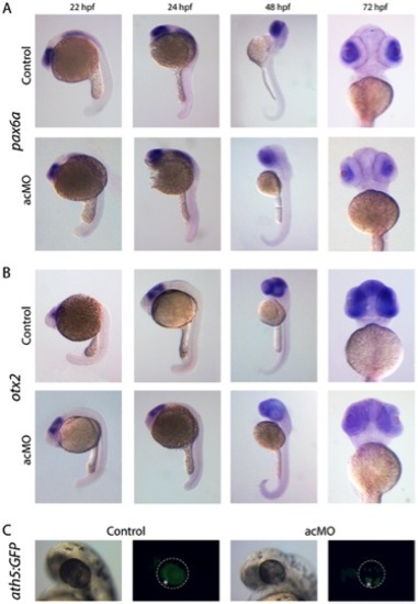 Expression of retina cell markers in acMO-injected embryos at early developmental stages. (A and B) At 22 and 24 hpf, the spatiotemporal pattern of pax6a (A) and otx2 (B) in acMO-injected animals was similar to that of controls: pax6a was detected in the forebrain, hindbrain, spinal cord and eye, and otx2 in the eye and midbrain. By 48 and becoming more evident at 72 hpf, acMO embryos exhibited a marked reduction in the expression of both markers. (C) The expression of the ath5 transcription factor was assessed in vivo in acMO-injected embryos of the transgenic ath5:GFP strain. At 48 hpf, the wave of ath5 expression, which prefigures the wave of retinal ganglion cell genesis, filled the central and peripheral retina of control embryos, whereas the pattern appeared delayed and disorganized in the acMO morphants, although RGC genesis was not fully abolished. * denotes the ventronasal patch of RGC genesis. EXPRESSION / LABELING: