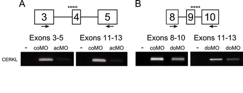 Validation of cerkl morpholinos. Transcriptional products obtained with the following sets of primers: (A) exons 3-5 and 11-13 for acMO samples, and (B) exons 8-10 and 11-13 for doMO samples. The comparable decrease in band intensity suggests transcript depletion in both cerkl morphants. |
