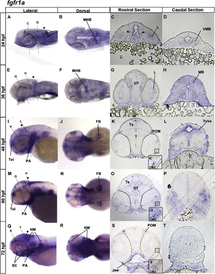 In situ hybridization of fgfr1a gene expression. In situ hybridization of fgfr1a gene expression at 24 hpf (A–D), 36 hpf (E–H), 48 hpf (I–L), 60 hpf (M–P), and 72 hpf (Q–T). Lateral views (A, E, I, M, Q) with anterior to the left, dorsal at the top, dorsal views (B, F, J, N, R) with anterior to the left, rostral transverse brain sections (C, G, K, O, S), and caudal transverse brain sections (D, H, L, P, T). Dotted lines indicate approximate orientation of imaged sections. Solid arrowheads indicate the location of the midbrain–hindbrain boundary. Arrowheads in C point to weak brain expression. Labels point to expression in the ciliary marginal zone (CMZ), dorsal thalamus (DT), fin bud (FB), jaw (J), lens (L), midbrain (MB), midbrain–hindbrain boundary (MHB), midbrain tegmentum (T), neuromasts (NM), optic tectum (Te), pharyngeal arches (PA), periocular mesenchyme (POM), splanchnocranium (SC), tectal ventricle (TeVe), telencephalon (Tel), and ventral midbrain (VMB). EXPRESSION / LABELING: