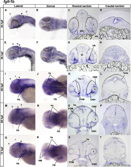 In situ hybridization of fgfr1b gene expression. In situ hybridization of fgfr1b gene expression at 24 hpf (A–D), 36 hpf (E–H), 48 hpf (I–L), 60 hpf (M–P), and 72 hpf (Q–T). Lateral views (A, E, I, M, Q) with anterior to the left, dorsal at the top, dorsal views (B, F, J, N, R) with anterior to the left, rostral transverse brain sections (C, G, K, O, S), and caudal transverse brain sections (D, H, L, P, T). Dotted lines indicate approximate orientation of imaged sections. Solid arrowheads indicate the location of the midbrain–hindbrain boundary. Labels point to expression in the fin bud (FB), lens (L), neuromasts (NM), optic nerve head (ONH), pharyngeal arches (PA), periocular mesenchyme (POM), tectal ventricle (TeVe), ventral diencephalon (VDi), ventral retina (VR), and ventricle (Ve). White arrowheads point to expression surrounding the lens (K, O, S). EXPRESSION / LABELING: