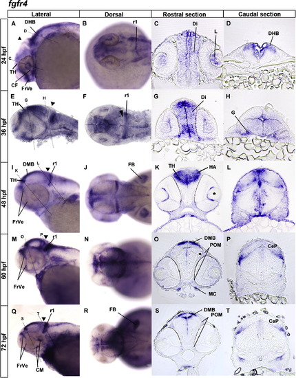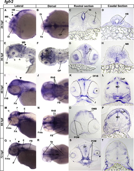 In situ hybridization of fgfr2 gene expression. In situ hybridization of fgfr2 gene expression at 24 hpf (A–D), 36 hpf (E–H), 48 hpf (I–L), 60 hpf (M–P), and 72 hpf (Q–T). Lateral views (A, E, I, M, Q) with anterior to the left, dorsal at the top, dorsal views (B, F, J, N, R) with anterior to the left, rostral transverse brain sections (C, G, K, O, S), and caudal transverse brain sections (D, H, L, P, T). Dotted lines indicate approximate orientation of imaged sections. Solid arrowheads indicate the location of the midbrain–hindbrain boundary. Labels point to expression in the cerebellar plate (CeP), diencephalon (Di), dorsal forebrain (DFrb), dorsal midbrain (DMB), dorsal thalamus (DT), fin bud (FB), forebrain (FrB), forebrain ventricular zone (FrVe), hindbrain (HB), inner ear (E), jaw (J), lens (L), medulla oblongata (MO), midbrain (MB), otic placode (OP), periocular mesenchyme (POM), pharyngeal arches (PA), pharynx (P), rhombomere boundaries (RhB), and ventricle (Ve). In panels K and S, the asterisk draws attention to expression surrounding the lens. EXPRESSION / LABELING: