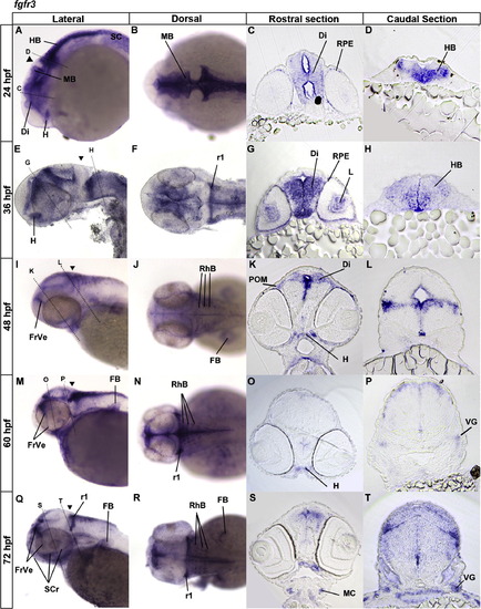 In situ hybridization of fgfr3 gene expression. In situ hybridization of fgfr3 gene expression at 24 hpf (A–D), 36 hpf (E–H), 48 hpf (I–L), 60 hpf (M–P), and 72 hpf (Q–T). Lateral views (A, E, I, M, Q) with anterior to the left, dorsal at the top, dorsal views (B, F, J, N, R) with anterior to the left, rostral transverse brain sections (C, G, K, O, S), and caudal transverse brain sections (D, H, L, P, T). Dotted lines indicate approximate orientation of imaged sections. Solid arrowheads indicate the location of the midbrain–hindbrain boundary. Labels point to expression in the diencephalon (Di), hypothalamus (H), hindbrain (HB), fin bud (FB), forebrain ventricular zone (FrVe), lens (L), mandibular cartilage (MC), midbrain (MB), periocular mesenchyme (POM), rhombomere boundaries (RhB), rhombomere 1 (r1), retinal pigment epithelium (RPE), spinal cord (SC), splanchnocranium (SCr), and vagal ganglion (VG). EXPRESSION / LABELING:
